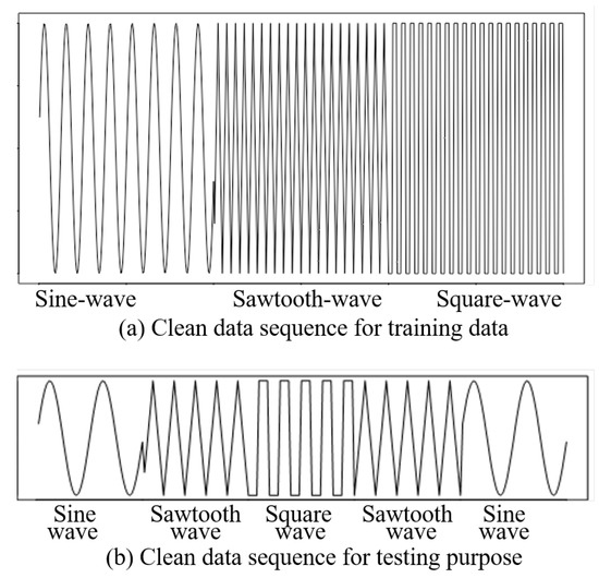Time-series data having three different signals: sine wave, sawtooth wave, and square wave; (a) clean data sequence for training data; (b) clean data sequence for testing purposes.