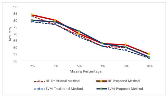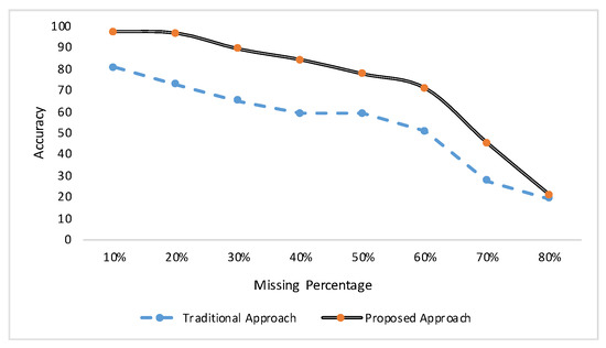 Therefore, we studied the effect of missing environment in the feature values [54]. Consequently, in this work, we created a missing environment in raw sensor data. We considered that missing data may occur during the period of raw sensor data collection in a practical environment. Here, we first created a simulated dataset to evaluate our approach of handling missing data. In the simulation dataset, we evaluated the performances on a clean environment. Afterward, we observed the performances in 10%, 20%, 30%, 40%, 50%, 60%, 70%, and 80% missing data on the simulated dataset.