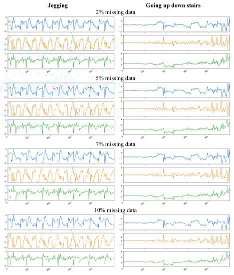 To demonstrate the variations and data loss patterns, we depicted two different actions and realistic missing patterns in Figure 4. In Figure 4, data sequences of two activity classes from the two datasets were demonstrated. Among the two datasets, the single chest dataset is an imbalance dataset in comparison to the relatively fairly-balanced HASC dataset. This shows how missing data were distributed among each activity class for different percentages of missing data. For missing data classification, we considered the missing at random pattern, which is a more realistic situation during real field data collection. We generated a random permutation of the sensor data with varied percentages. In this scheme, there was no specific patterns or locations or clustering. It is the sensible scenario while assembling sensor data from multiple sensors; missing data may occur at random patterns, which can be distributed at any location in the data. We embraced two activity classes: ‘jogging’ and ‘going up down stairs’ from two benchmark datasets to illustrate the distributions of data missing in various percentages of missing data. Missing rates were from 2% to 10%. Accelerometer data for x-, y-, and z-axes are shown for each case. In the real dataset, it was not considerable to have missing data for more than 8% to 10% in the context of activity recognition.