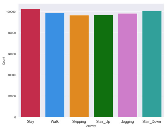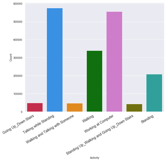 Figure 5 and Figure 6 exhibit the activity counts of HASC and single chest dataset. HASC dataset has regular activity classes, whereas, the single chest dataset has two overlapping activities for each class. For example, the going up and down stairs together comprise as one class; whereas, the standing up-walking and going-up-down stairs combine as another class. We considered two datasets so that we can evaluate activity recognition performance having missing data in straightforward activity classes, as well as on several overlapping activity classes.
