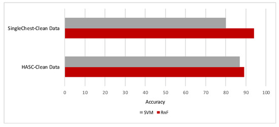 To count the missing ratio, we found that missing ration between 400 and 600 ms is 1.15% and missing ratio between 600 and 800 ms is 1.27%, while it is 0.54% during 800 and 1000 ms sampling duration. It is not a large missing ratio in this real application setting. The reason is that our entire networking system and battery lives of sensors were properly checked and enriched with the best-possible manner, so that no missing data can happen. However, in real-life, the causes of missing data may happen and we can face more challenges. After this realistic dataset analysis for missing pattern and missing sample ratio, we can ascertain that our proposed approach can be applicable for realistic settings as well to improve activity recognition. If the missing pattern is random and the missing ratio is approximately 2%, then using our proposed approach, we achieved enriched accuracy up to 88% (for the HASC dataset) and 84% (for the single chest dataset) by using the RnF classifier, and 86% and 80% for these datasets, respectively, by exploiting SVM classifier.