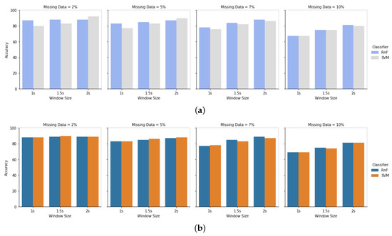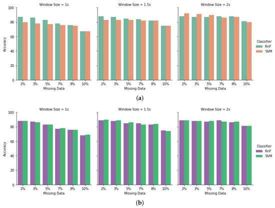 Evaluation of the single chest dataset for window size 1 s, 1.5 s, and 2 s. Missing percentage 2%, 5%, 7%, and 10% in two scenarios: (a) single Chest dataset for the traditional approach; (b) single chest dataset for the proposed approach.