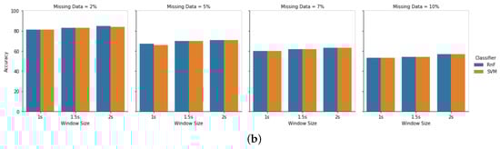 We tested in different percentages of missing data levels. Table 2 represents the comparative result analysis of 5% and 8% missing data in both datasets. We observed that when we added even 5% missing data in the testing module, the recognition rate became 83% by using RnF in HASC dataset, whereas it lowered to 69% in the single chest dataset when only the test module had missing data. By using the SVM classifier too, it was 82% in the HASC dataset, but 68% in the single chest dataset: even the recognition performance in single chest dataset reduced to 60%, when 8% random missing data were present in the test dataset. Performances always improved slightly when using our proposed method when both training and testing modules had missing data in both datasets. On the other hand, for the HASC dataset it was 73% when using RnF and SVM. We evaluated the performances with different window sizes, both datasets performed well with a higher window size in any missing percentages. We evaluated different missing percentages (e.g., 2%, 3%, 5%, 7%, 8%, and 10%) for different window sizes (i.e., 1 s, 1.5 s, and 2 s)—as demonstrated in Figure 12. We observed that the window time of 2 s has performed well in any missing percentage situations. The performances improved for having missing data in both the testing and training modules. We can state that the amount of data is an important issue to estimate the correct activity labels even having a missing data environment. Finally, we noticed that the fairly balanced HASC dataset can handle missing data in a considerable manner, compared to the single chest dataset, which is a more imbalanced dataset. We chose these two different, but genuinely challenging, datasets to manifest the validity and robustness of our approach.