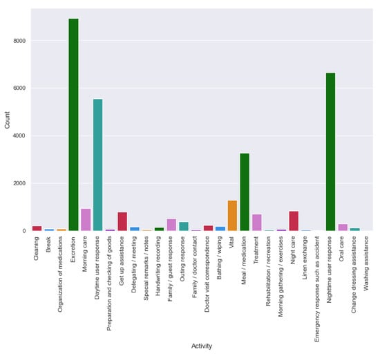 Nevertheless, we mention one of our datasets that is explored in a realistic setting on a real-field nursing care dataset [15]. We present this information to show that even in real-life, missing data in sensors are mostly random in nature, which we have explored in this work. In the paper [15], we introduce a system to integrate activity recognition into nursing care record system. The system exploits smartphones to create nurse work and care records, and explores a cloud service to collect sensor data for activity recognition in a real nursing care center for four months. During this experiment, 38,076 activity labels, 2834 h of sensor data, and 46,803 care details were collected. Figure 13 shows that this dataset contains 28 complex nursing care activity classes for regular nursing care support, which was challenging to collect, such as vitals (checking), excretion, bathing/wiping, etc. To collect nursing care residents’ complex activity data, 27 people, including 23 caregivers and 4 nurses, conducted this experiment in a real nursing care facility center. It required capturing continuous sensor data by using mobile sensors to capture nursing activities; however, there is still a challenge due to the missing samples.