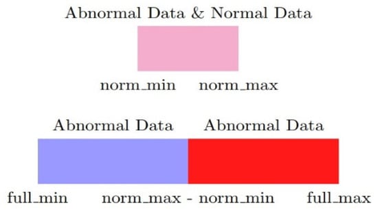 First, not all of the input dimensions have the over-scaling problem; thus, these need to be found and taken out. The remaining dimensions can be normalized by common methods. Second, for each potentially over-scaled dimension, the minimum and maximum values of the normal labeled data and full dataset should be designated as , , and as in Figure 1. Third, the input data should be split into two dimensions. The values in the first dimension that fall into the normal range are normalized with and as the minimum and maximum values. In the second dimension, values outside the normal range are normalized with and as the minimum and maximum values as Figure 2. Finally, the two new dimensions are normalized with new values and ranges to preserve the meaning of the number itself and alleviate the over-scaling problem. Composed is input, is the first dimension, is the second dimension, , , , are the short names of , , , , respectively. Additionally, is the minimum function, is the maximum function. The normalization method can be presented as below: