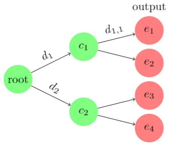 The logical decision process in the decision tree is defined as the function , which means that when the input x satisfies the condition , is returned, contains the data and status after decision. Then the calculation process for the data of type can be described as , where is the intermediate result. In a real environment, after each decision, the information obtained will be more certain, that is, the uncertainty of the data will decrease as the discrimination process proceeds. According to the definition of mutual information, the mutual information relationship between the output data (data in chance nodes and end nodes ) and the input data in the decision tree model is shown in Equation (5):
