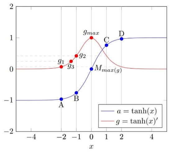 Let be the activation function and A, B, C, and D be the samples in the dataset. (A, B) is a set of the target sample and comparison sample, is the value of sample A, is the activation of sample A, and is the maximum value of the derivative function of . Make , and is the sample that takes the maximum value of the partial derivative function. Make . is the relevance value, and . is the partial derivative, default set as . For the example in Figure 2, , , and .
