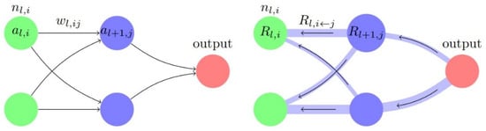 In the DNN model, the multi-layer computing structure can be split into multiple single-layer structures for continuous transfer. Let be the number of layers, be the neuron in layer , be the difference of the output of the abnormal sample and the comparison sample at , be the partial derivative obtained by the above method, be the relevance of , and be the relevance transferred from to as in Figure 5. The relevance transfer calculation method can be described by Equation (7):