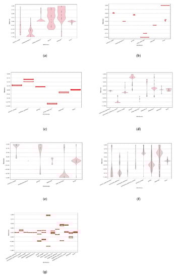 After the MDH was obtained for each anomaly class, the relevance between the input and resulting change in each sample was calculated with the proposed method. Figure 7 displays the normalized calculation results as scatter plots or violin plots.