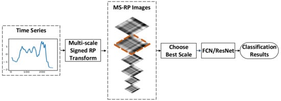As shown in the figure, the input time series are first transformed into images through MS-RP. Then, the MS-RP images are produced in various scales, and the images with best scale are selected. Finally, the selected images are taken as the input of FCN and ResNet classifiers instead of the original sequences for classification.