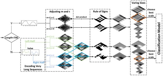 Firstly, sequences of different datasets vary significantly in length and their distinctive regions usually distribute on various scales. Existing methods deal with this problem only by adjusting the image size [,,,]. However, to avoid high computational overhead, the adjustable size is limited to a small range, which often decreases the representation ability of RP. We address this challenge by additionally introducing phase space dimension (m) and embedding time delay () of RP, which are fixed in other methods [,,,]. Different values of m, , and image sizes are explored according to different datasets in order to enrich the scales of RP images. The images with suitable scales will be selected as the input to a classifier.
