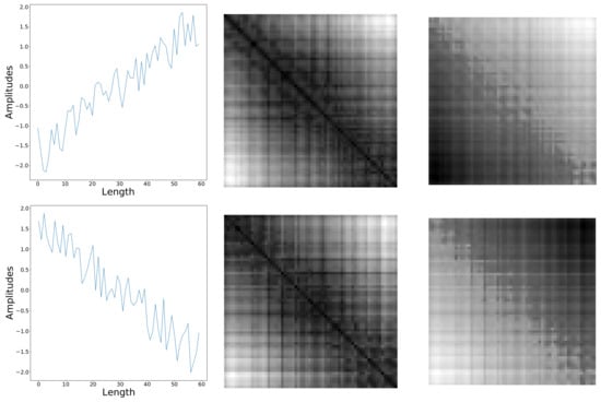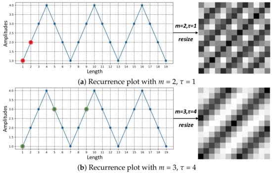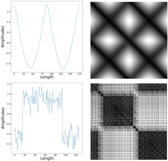 RP is a visualization tool widely used to analyze the recurrent behaviors of time series generated in dynamical systems [,]. Concretely, a sequence is mapped to m-dimensional phase space; then, RP image of the sequence is achieved by calculating the distance matrix between the states in the phase space. RP reveals the local correlation information of a sequence through distance calculation between subsequences, while autocorrelation information is crucial to TSC []; thus, it is widely used to encode sequences as images (see Figure 3). Equation (1) defines RP formally: