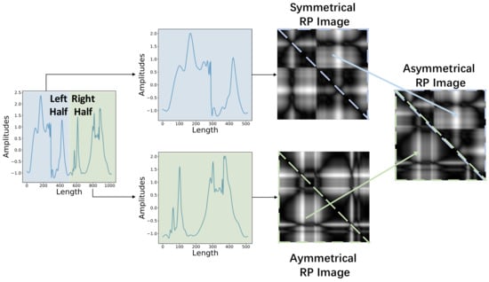 To address this challenge, asymmetrical RP is proposed. Figure 5 shows the process of constructing an asymmetrical RP image. As is shown, a sequence is halved into two pieces, and each piece is encoded as an image. Then, the upper and lower oblique triangle matrixes of the two images are extracted separately and then reassembled in one image, utilizing the symmetrical structure of RP. Through constructing the asymmetrical RP images, we alleviate the information loss brought in the resizing process, and overcome the information redundancy problem of symmetrical RP.