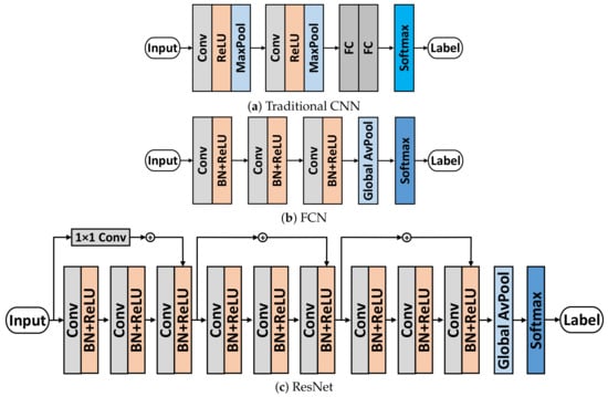 To address these problems, in this paper, FCN and ResNet are introduced to handle MS-RP images, which are expanded to 2D-version according to the image data format. FCN and ResNet are firstly proposed as baseline classifiers in [], and they are widely regarded as the state-of-the-art classifiers for TSC []. The architectures of these two networks are shown in Figure 7b,c. FCN is a fully convolutional network, which has three convolution layers; each layer follows a Batch Normalization (BN) layer and a Rectified Linear Unit (ReLU) activation function. FCN has no Fully Connected (FC) layers. After the convolution process, the features pass through a Global Average Pooling layer and a Softmax layer for classification. ResNet expands FCN through residual connections. It has three residual blocks, and each block has the same structure with FCN. ResNet explores a network with deeper architecture; it is a compromise for balancing better representations and overfitting.