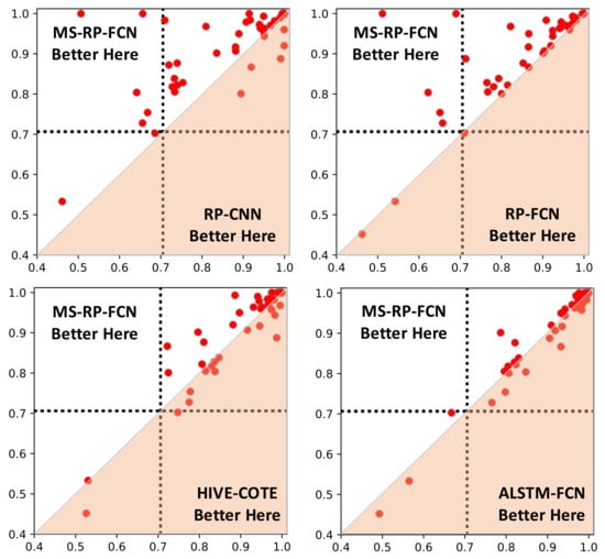 Comparison of classification results is listed in Table 2, with the best performance of each dataset highlighted in bold. The CD diagram is shown in Figure 8. Moreover, pairwise comparison between MS-RP-FCN and its competitors are provided in Figure 9.