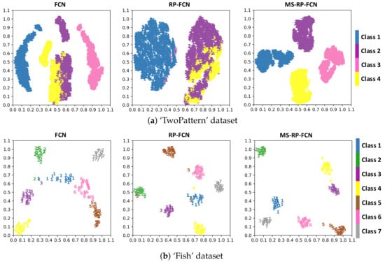 In order to visually demonstrate that MS-RP better utilizes the advantage of DNN in extracting features, we gain some insights on the spatial distribution of the latent representation learned by the networks. Specifically, we feed the raw data, RP images, and MS-RP images into FCN respectively, and extract the last latent representations (feature vectors of global average pooling layer) learned by the network. Then, t-Distributed Stochastic Neighbor Embedding (t-SNE) [] is introduced to visualize the classification results of different input data. It is a technique embedding high-dimensional vectors into a two-dimensional map.