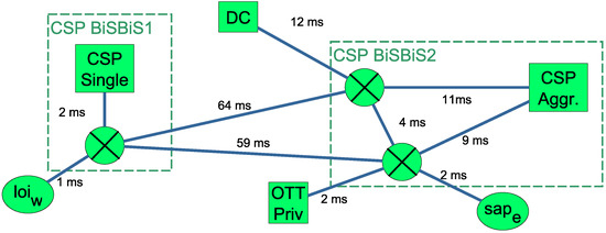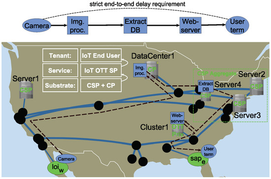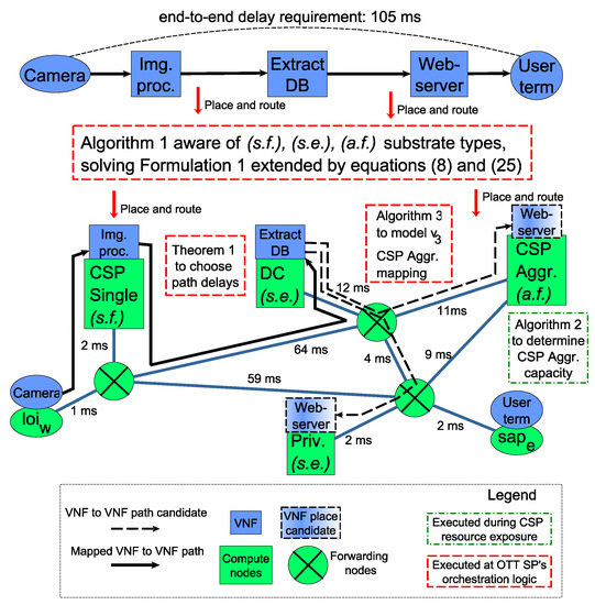 ) is to the east. Service Access Points (SAPs) are the user locations where the service is to be consumed, possibly by another service or a person. Location of Interests (LOIs) represent location-bound points, where the sensors (i.e., security cameras) are located. These should be used as service delay reference points, because the service quality is primarily experienced here. All auxiliary functions realize the service needs to be allocated on a network path between the reference points with meeting the strict delay requirement. The CSP provides communication capabilities between the distributed cloud of a Cloud Provider (CP) having its computation nodes apart with significant geographic distance. The OTT SP is in a business relationship with a CP, reaching its data center through the CSP’s network, while also owning a private cloud proximate to site