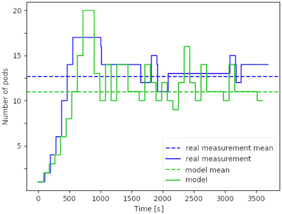 The HPA’s scaling interval is set to 1 min, with targeted scaling metric , scaling tolerance and pod limits , . The model utilizes the calculated arrival and processing rate of the webserver VNF during the current scaling interval. So that, not only a fixed pair of arrival rate and processing rate is given (as shown in Algorithm 3), but the realization of the randomized processes is used to calculate the local rates. This approach slightly generalizes the algorithm to provide a reasonable comparison to the measurement, as the Kubernetes HPA is not aware of the exact rates used for generating the arrival and processing times. These estimated rates are used as the input for the nextHPAPodCount() function to predict the utilization metric, and thus predict the number of active pods for the next scaling interval. The experiment starts with a single running pod, when both the model and the measurement initially over-provisions with very similar extent and timing. Both trajectories follow the slight oscillation around the equilibrium pod count of 11–13, resulting in at most −/+15% deviation.