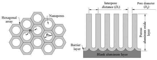 where Dp and Dc are the pore diameter and the interpore distance, respectively. The density of pores, defined as the total number of pores occupying a surface area of 1 cm2, can be expressed by the following Equation (2):