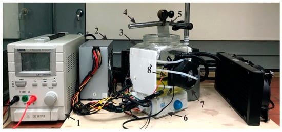 Experimental setup for the fabrication of a nanoporous anodic aluminum oxide (AAO) membrane: 1, a DC power unit; 2, a power supply unit for the Peltier element and master cooler; 3, a glass jar for electrolyte bath; 4, a holder for specimen; 5, A specimen (aluminum sheet); 6, a magnetic stirrer; 7, a master cooler (MLW-D24M, Cooler Master Technology Inc, Taipei, Taiwan) for the Peltier element; and 8, the Peltier element (TEC112715, Hebei I.T. (Shanghai) Co., Ltd., Shanghai, China).