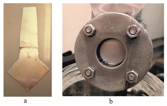 Before beginning the experimental setup (Figure 2) of the electrochemical anodization [12], a large aluminum sheet was cut into a square-shaped sample 10 × 10 cm in size and ultrasonically cleaned with acetone (C3H6O) for 5 min. The mechanical cleaning was done with the buffing disc until the surface of the aluminum sheet shone like a mirror and then cleaned with acetone (C3H6O). The cleaned sheet was then was cut into a specific shape (Figure 4a) to be easily fixed in the specimen holder (open area 30 mm diameter) (Figure 4b). Later, the sample was immersed in concentrated phosphoric acid (H3PO4) for 5 min in order to make surface hydrophilic without losing the gloss of the aluminum surface (during this step, the surface of the aluminum was covered with dense hydrogen bubbles).