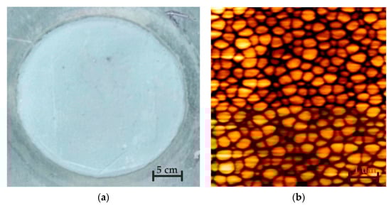 For the surface morphology and topography measurements, atomic force microscope (AFM, Veeco/TM CP-RII SPM system, SPECS GmbH, Berlin, Germany) was used. AFM has multiple operating modes, with a scanning field of 100 × 100 µm, a height up to 15 µm with an area for samples that is up to 100 mm in diameter and 50 mm in height. A photo of a fabricated nanoporous AAO membrane using two-step anodization (oxalic acid) is presented in Figure 6a. The surface morphology of the produced element with a 2D view of arbitrary selections sized 3 × 3 µm is given in Figure 6b.