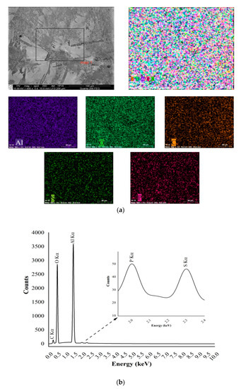 Energy dispersive X-ray spectroscopy (EDS) analysis gives qualitative and quantitative determinations of the elemental composition of the formed nanoporous AAO membrane. The full composition is presented in Figure 9b. These microanalyses show the dominance of Al2O3 (aluminum oxide), aluminum with a Kα peak at 1.479 keV, and oxygen with a Kα peak at 0.5 keV (Figure 9b). Other peaks show smaller quantities of carbon (Kα peak at 0.37 keV), phosphorous (Kα peak at 2.01 keV), and sulphur (Kα peak at 2.307 keV). More detailed information on the normalized concentrations of the weight and the atomic percentages of the chemical composition of formed nanoporous AAO membranes is given in Table 2.