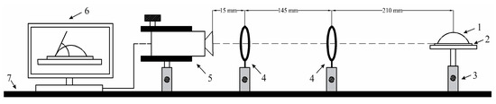 Illustration of the critical distance between parts for angle measurements: 1, droplet; 2, analyzed AAO specimen; 3, adjustable stand for specimen; 4, double convex lenses; 5, Guppy F-503 high speed B&W CMOS camera; 6, computer system for analysis of the captured image; and 7, anti-vibration table surface for stability of the image.