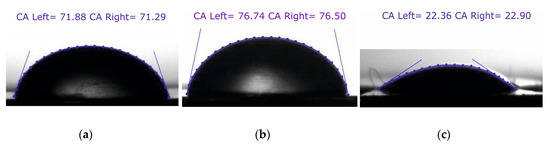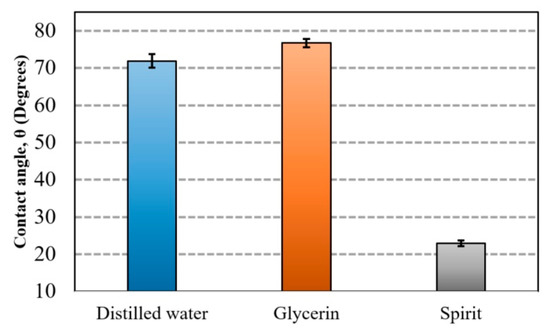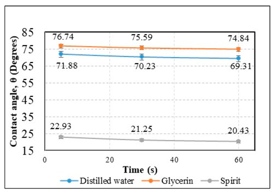 A gradual decrement was observed for the water contact angle (θ) 71.88°, 70.23°, and 69.31° at 5 s, 30 s, and 60 s, respectively. Similarly, a gradual decrement was observed in the contact angle for the glycerin and spirit droplets after 5 s, 30 s, and 60 s, as shown in Figure 14. After 60 s, the droplets of all fluids were found to be stable, i.e., there was no change in the contact angle.