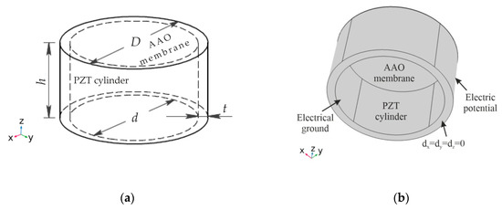 The behavior of the fabricated nanoporous AAO membrane was investigated numerically using COMSOL Multiphysics 5.4 software. A three-dimensional numerical model (Figure 15) was constructed to elucidate the change in the displacement of the nanoporous AAO membrane surface, when excited with SAW in the presence of amplitude modulation. The simulation model (Figure 15a) consisted of a piezoelectric cylinder (PZT-5H, inner diameter d = 30 mm, thickness t = 2 mm, and height h = 15 mm), used as an actuating member, and the fabricated nanoporous AAO membrane (diameter D = 30 mm and thickness 0.16 mm) on top. The boundary conditions of the analyzed model are given in Figure 15b, and the properties of the piezoelectric material are presented in Table 3.