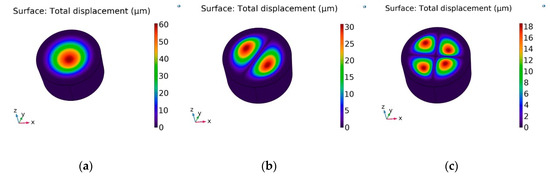 The results of the dynamic response of the membrane, actuated by using PZT-5H, are presented in Figure 16. A deformation of the membrane, generated with an electrical excitation of 0.43 V at a frequency of 3.5 kHz (the first natural frequency mode), is shown as the total displacement field (Figure 16a). It can be observed that the geometry of membrane has displacement, mainly concentrated in the center, i.e., the membrane oscillated in half wave mode. Meanwhile, in the second mode, the natural frequency of system was achieved with an electrical excitation of 1 V at a frequency 4.94 kHz, with two halves of the membrane on the surface with 180 shifts in phase (Figure 16b). The membrane surface with four quadrants was achieved at 7.89 kHz frequency (Figure 16c). Therefore, it is possible to state that the geometry of the nanopores can be controlled by employing vibration. The acceleration of driving frequency leads to an increase in the concentration of the particle near the center of the pores and reduces friction, which may damage the cell membrane.
