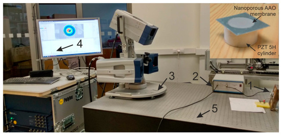 Experimental setup (3D scanning vibrometer PSV-500-3D-HV) for the actuation of the membrane: 1, nanoporous AAO membrane fixed on PZT 5H cylinder as shown right top corner; 2, voltage amplifier; 3, 3D scanning vibrometer (PSV-500-3D-HV, Polytec GmbH, Waldbronn, Germany); 4, computer system with software; and 5, anti-vibration table.