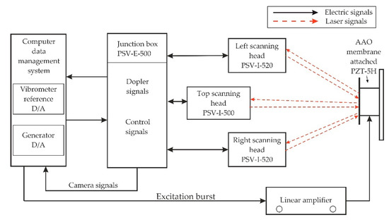 The experiment was performed under stable conditions, i.e., no external vibrations acting on the membrane. The PZT actuator was fixed on the steel plate with the help of glued tape and placed on the anti-vibration table. The PZT 5H cylinder was connected to the voltage amplifier by an electrode for voltage amplification. Using a computer system with integrated with software, points were set with the Polytech laser at the periphery of the aluminum oxide membrane covering the measurement geometry (shown in Figure 17, computer screen). Vibrations in the actuator were generated by electrical signal 5 V. A schematic of the experimental setup with the 3D scanning vibrometer is shown in Figure 18.