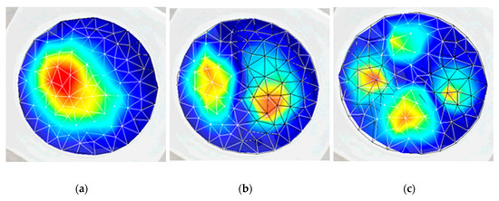Experimental result (3D scanning vibrometer PSV-500-3D-HV) response of the actuator on the surface of the membrane at different frequencies: (a) 3.62 kHz (first mode of vibration); (b) 5.94 kHz (second mode of vibration); and (c) 7.89 kHz (third mode of vibration).