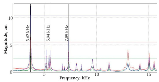 Resonance mode of the actuator from 3D vibrometer frequency response characteristics: a resonance mode of the actuator at 3.62 kHz, 5.94 kHz, and 7.89 kHz with different colors showing displacement directions: x – green, y – red and z – blue.