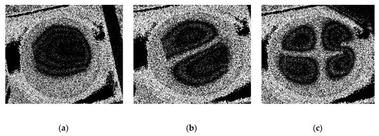 Experimental (holographic interferometry PRISM) response of the actuator on the surface of the membrane at different frequencies: (a) 3.8 kHz (first mode of vibration) at 0.43 V; (b) 5.18 kHz (second mode of vibration) at 0.44 V; and (c) 8.06 kHz (third mode of vibration) at 2.12 V.