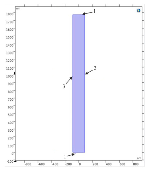 A formed nanoporous AAO membrane was proposed for the ultrafiltration of the nanoparticles in the fluid of the micro-hydro-mechanical systems. Therefore, a simulation was performed to determine the acoustic pressure distribution, particle motion, and operating frequencies for the nanotube, distributed in the AAO membrane. Using the acoustophoresis method, a symmetrically distributed nanocavity of hexagonal tube shape with a rectangular cross-section (2D model) (shown in Figure 24) was selected for the simulation of the bioparticle. For this purpose, COMSOL Multiphysics 5.4 was used. The main parameters for the simulated model are presented in Table 4.