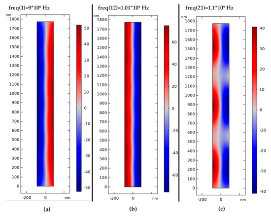Acoustic pressure distribution in a nanochannel excited at: (a) 900 MHz; (b) 1001 MHz; and (c) 1100 MHz.