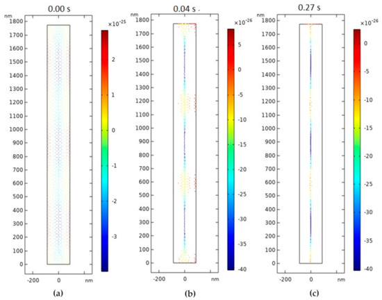 A form of the transverse oscillation at 900 MHz frequency provides the lowest acoustic pressure in the center of channel (Figure 25a), which means that the nanoparticles are concentrated in the center of nanotube. The nanoparticle responds to primary acoustic radiation force when dispersed in an ultrasound standing wave by moving to specific locations along the wave. These results were used for further analysis. An increment in the frequency results in the disorder of the acoustic pressure inside the nanochannel, leading to an increase of friction between the particle and nanochannel wall, while passing through it (Figure 25b,c). The difference in pressure affects the movement of the particles and orients them in the center. A second study was performed to determine how long it takes for a nanoparticle to focus on the center of a nanochannel. For this purpose, the analysis time was chosen from 0 s to 0.3 s by 10−4 s step. The obtained results (Figure 26c) showed that the nanoparticles with a diameter of 23.65 nm and a density of 500 kg/m3 (such as the nanoparticles of dust, sawdust, and carbon) focused in the center of this nanochannel in just 0.27 s.