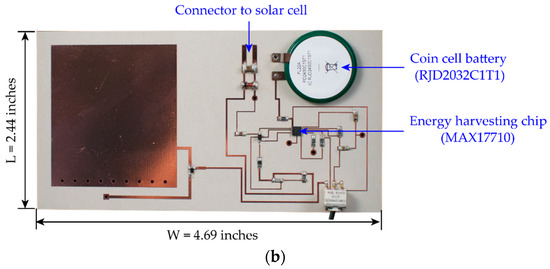 The power management circuitry derives energy from solar radiation and supplies regulated voltage to the RFID chip. The energy harvesting IC (integrated circuit) chip MAX17710 (manufactured by Maxim Integrated, San Jose, CA, USA) is adopted for this application. This IC chip both charges a cell battery with over-charge protection and powers the RFID chip with over-discharge protection. The harvested solar energy is stored in a high-capacity Lithium-Ion rechargeable coin cell battery RJD2032C1T1 (manufactured by Illinois Capacitor, Des Plaines, IL, USA), which improves the reliability of the patch antenna sensor.