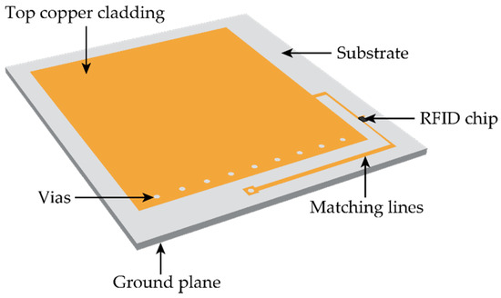 Figure 1 shows the front view of the passive patch antenna sensor. The total size of the antenna sensor is 2.17 × 2.36 inches2. The sensor adopts a quarter-wave rectangular patch (folded-patch) antenna topology [26]. The top copper and the ground plane are connected through vias, allowing about a 50% reduction to the footprint size of the patch antenna. The length of the top copper cladding is designed so that the resonance frequency of the antenna sensor achieves about 900 MHz RFID band. To enable efficient power transfer, the lengths of matching lines are tuned to achieve impedance matching between the RFID chip (21.2 − j199.7 in passive mode [27]) and the patch antenna.