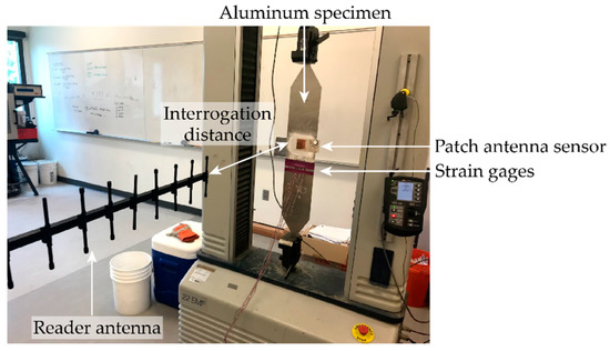 Laboratory tensile tests are conducted to evaluate the strain sensing performance of the dual-mode patch antenna sensor. Figure 9 shows the experimental setup for the tensile test on the dual-mode patch antenna sensor. The patch antenna sensor and reference metal foil strain gages are installed in the middle of an aluminum specimen. A Yagi antenna is used as the interrogation reader antenna. The interrogation distance between the patch antenna sensor and the reader antenna is set as 36 inches for passive mode test and 60 inches for active mode test.