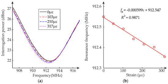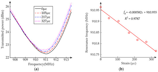 The resonance frequency of the patch antenna sensor at each strain level is determined by peak picking of each average interrogation power threshold curve. As expected, the resonance frequency decreases as the tensile strain increases. Figure 10b plots the resonance frequency change with the strain. Linear regression is applied to these data points, and the strain sensitivity is calculated as −599 Hz/. In addition, the coefficient of determination is 0.9871, confirming the approximately linear relationship between resonance frequency and strain.