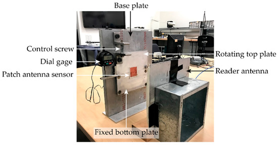 To investigate the crack sensing performance of the patch antenna sensor, an emulated crack test is carried out. Figure 12 shows the crack test setup, including a crack testing device which is designed for emulating crack propagation. The crack testing device consists of three aluminum plates, i.e., a base plate, a rotating top plate, and a fixed bottom plate. The fixed bottom plate is fastened to the base plate by four corner bolts. The rotating top plate is attached to the base plate by one bolt at the bottom right corner, which acts as the rotation axis. All three plates are thick enough and can be assumed to remain rigid during crack testing for the sensor. A pair of angle brackets are fastened on the rotating top plate and the base plate. By turning a fine-resolution control screw between the angle brackets, the top plate rotates along with the bolt and a crack/gap is opened between the top and bottom plates. With the probe pushing against an angle bracket attached to the top plate, a digital dial gauge (0.0001 in. resolution) is used to measure the crack opening size.