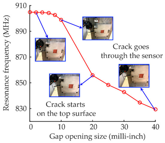 In total, eleven gap opening sizes are wirelessly measured during the experiment. The resonance frequencies extracted from interrogation power curves are plotted in Figure 13. For clarity, only four representative photos of the deformed/cracked antenna sensor are shown in the plot. No fracture but slight deformation occurs on the sensor when the gap opening size is smaller than 10 milli-inches. When the gap opening size is larger than 20 milli-inches, the crack starts to propagate on the top surface of the sensor. After the gap opening size reaches 40 milli-inches, the crack grows through the entire antenna width and no response from the antenna sensor can be received by the Tagformance reader.