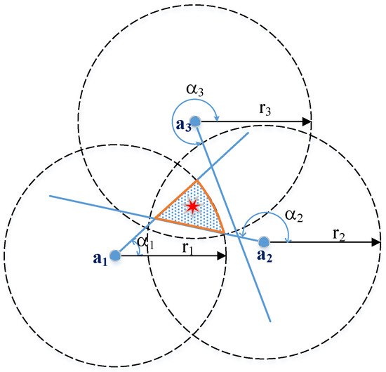 Geometrically, conventional hybrid AOA/RSSI localization aims to reduce the area where the agent possibly resides, as shown in Figure 2. However, not all of the AOA measurements contribute to the improvement of the accuracy, especially, when AOA estimation suffers from high measurement errors. Since a high-resolution AOA estimation requires complicated signal processing and a large antenna array, conventional hybrid AOA/RSSI leads to complex anchors and so does the WSN.