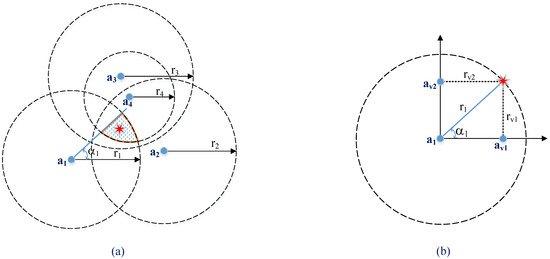 The agent’s location can be found with as few as two anchors using the bilateration method [6], which plots two circles centered at the two anchors and uses one of their intersections as the agent’s position. However, due to the noise effect, the two circles may not intersect and the location cannot be found. Therefore, normally, at least three anchors are required, so Equation (3) becomes an overdetermined set of nonlinear equations. To solve this problem, it can be firstly transformed into linear equations and then solved by a linear LS solution. As presented in [22], choosing the r-th anchor as a reference anchor, and then subtracting the remaining equations in Equation (3) to the r-th one, we have a set of linear equations as