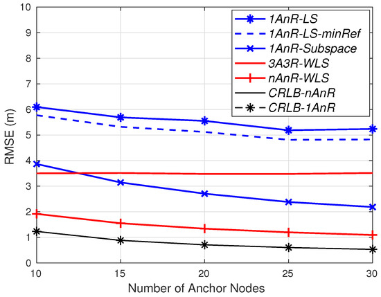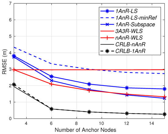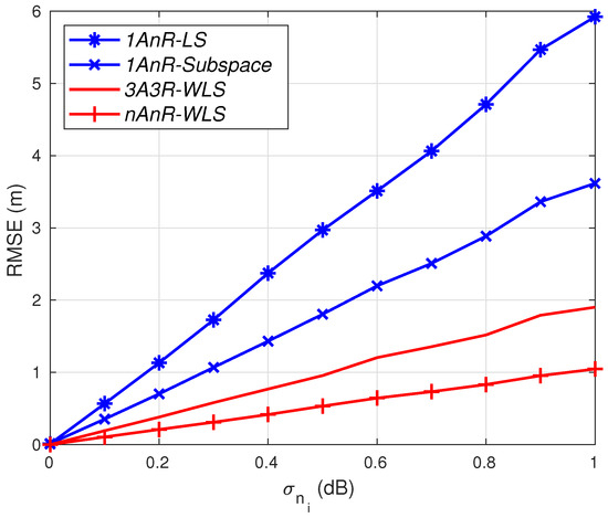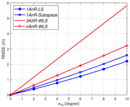 Figure 4 shows the RMSE obtained by different methods with anchors. We can see that—if perfect ranging measurement is obtained, i.e., dB—AOA estimation errors cause nAnR-WLS to be worse than both 1AnR algorithms. The reason is that when AOA estimations suffer from significant errors, such as under a non-line-of-sight (NLOS) environment, the more AOA information is involved and the worse the level of precision that can be obtained.