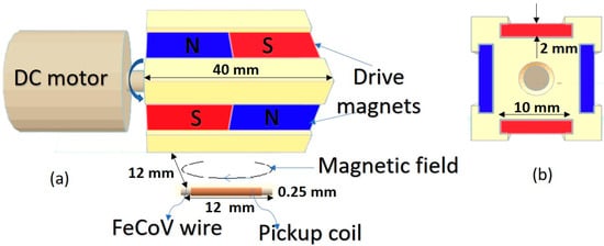 A Weigand sensor (FeCoV wire and pickup coil) and the arrangement used ((a) front view and (b) side view) to generate electrical power.