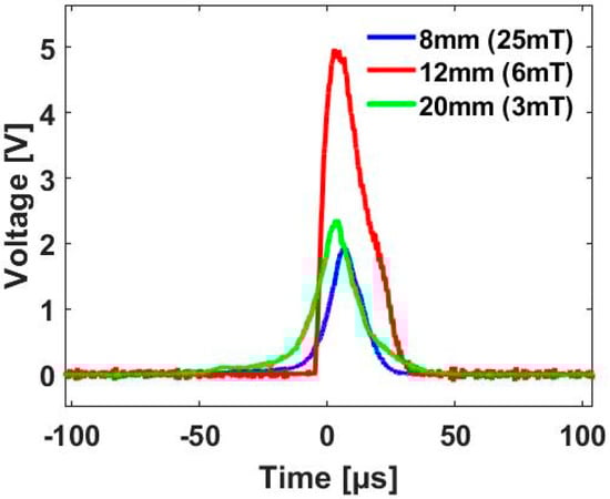 Voltage pulses at distances of 8, 12, and 20 mm corresponding to magnetic field intensities (µ0H) of 25, 6, and 3 mT.